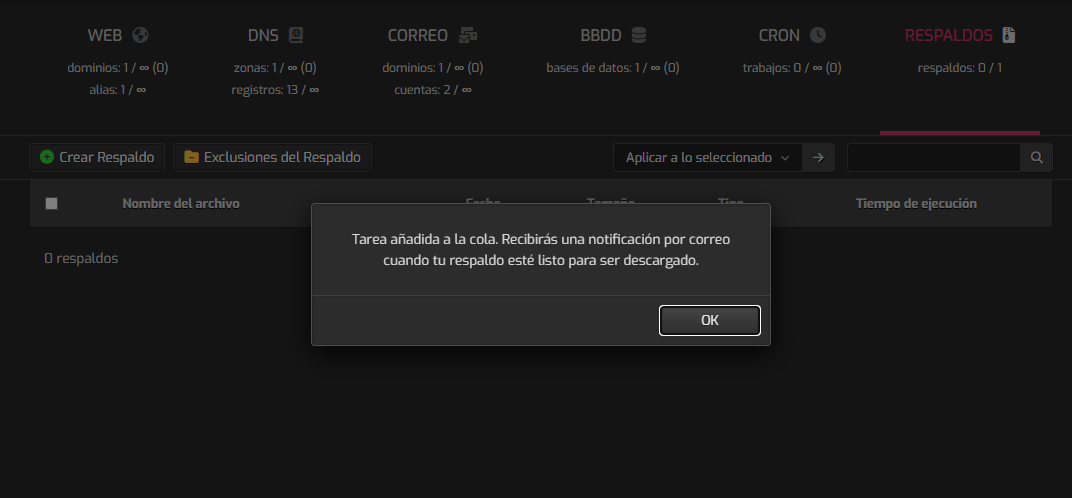 Tal como menciona la ventana emergente, cuando sea completado el respaldo, recibirá una notificación en la campaña que se encuentra en la parte superior derecha.